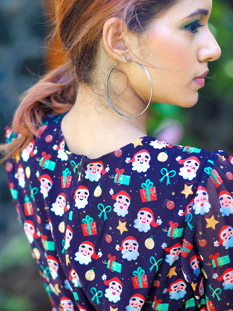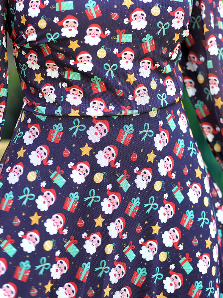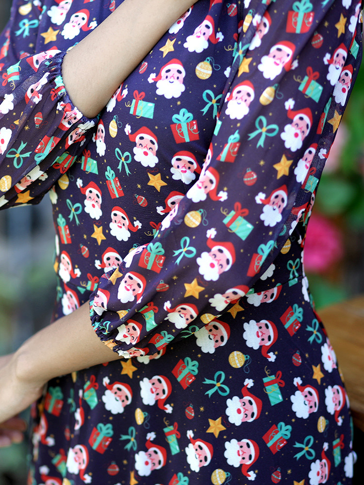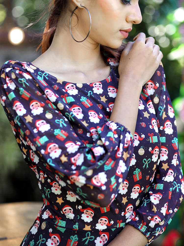 Get this Chic Black Christmas Maxi dress and be versatile. This is a ¾ th sleeved Maxi dress is a perfect festive wear. This dress is adorned with Round neck and Santa print.