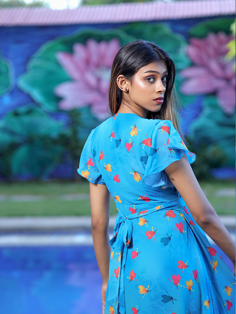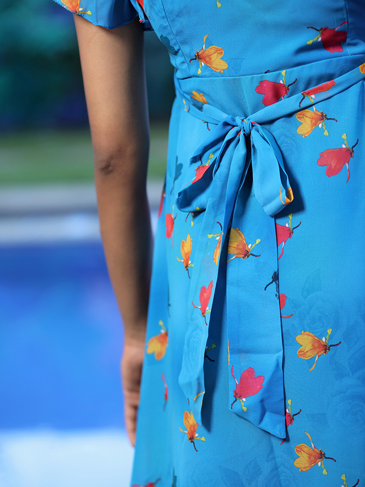 Stylish and effortless, pick this Blue midi dress to take your off-duty style up a notch. This chic dress features a mix of floral prints, ruffle sleeves, frill details and a belt to accentuate waist.