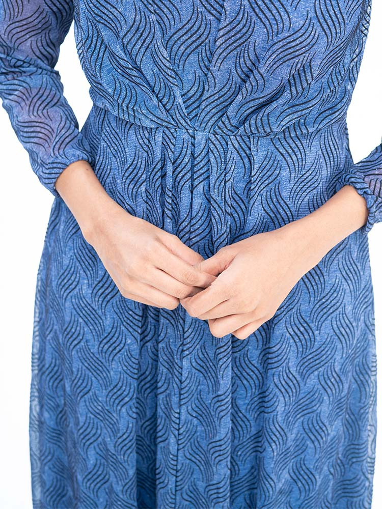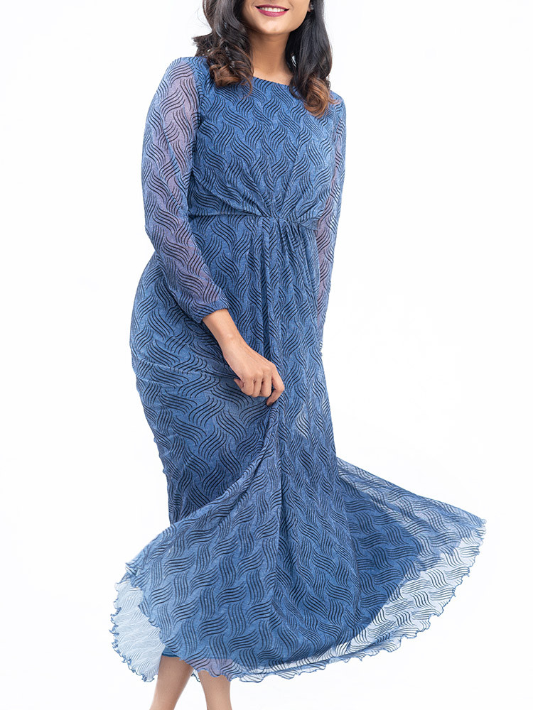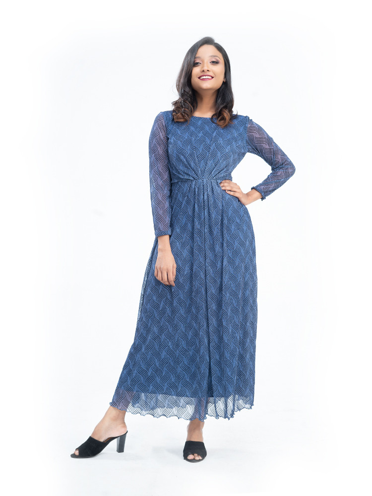 Exuding a jazzy look this dress has gathered details, round neck, full sleeves, flared helm and an attached lining
