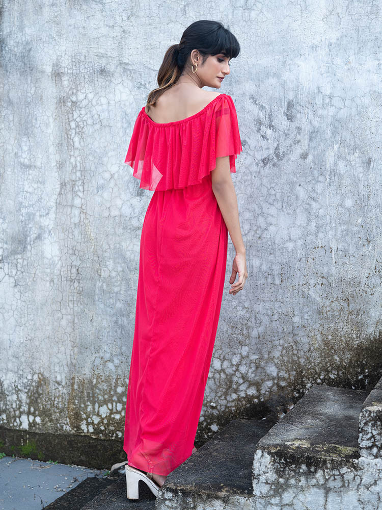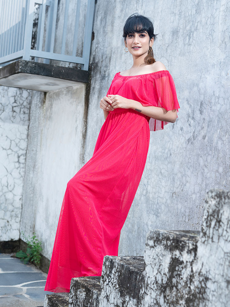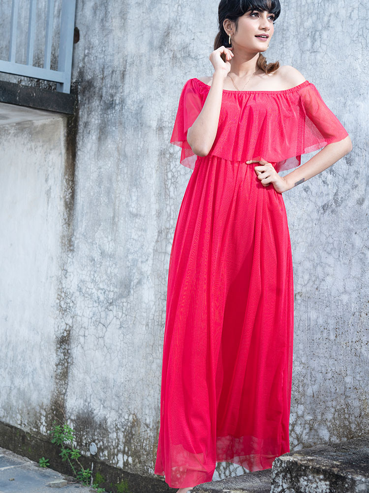 Coral off shoulder maxi dress:Brace style with this coral maxi dress that features an off shoulder neck, a flared helm and concealed zip closure.