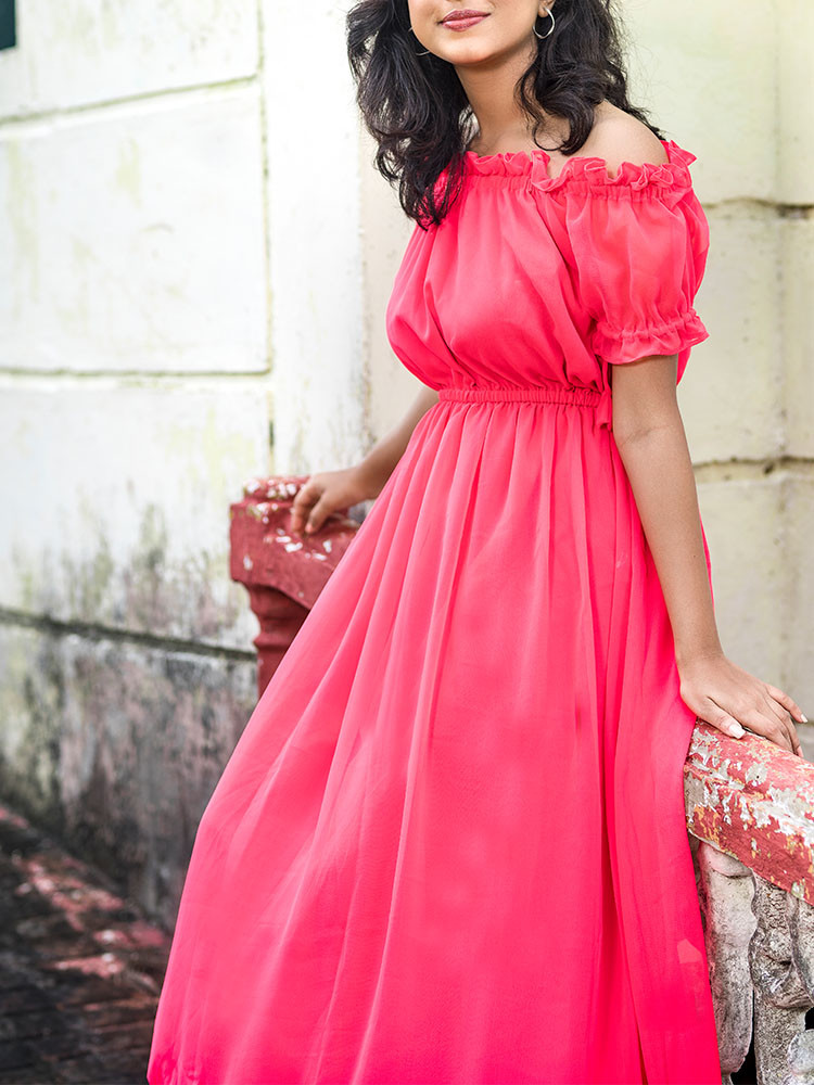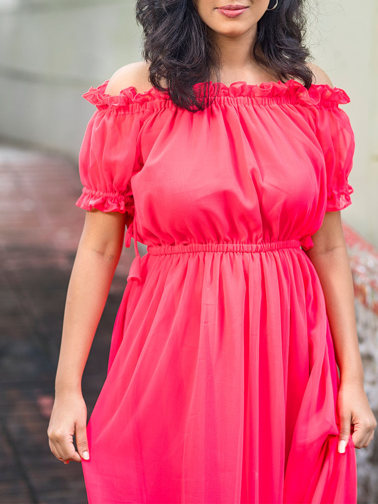 Riding on bearings like Off shoulder, short sleeves, flared hem and an attached lining this coral dress carries a style that is hard to miss.