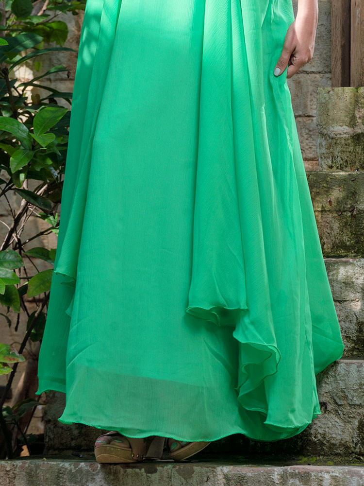 Drive up on the stylish front with this Green Solid Maxi a dress that has a V Neck, rougher details, sleeveless and flat hem.