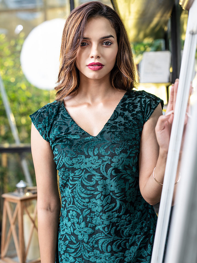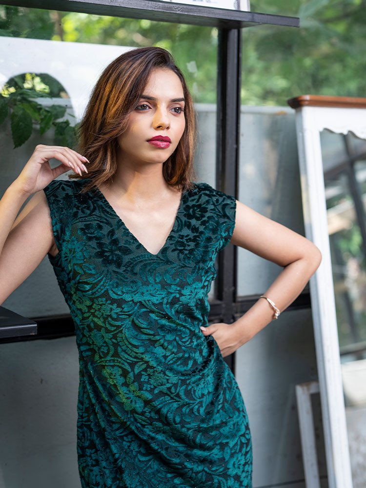 Be the cynosure of all eyes with this Green Velvet sheath dress that pack