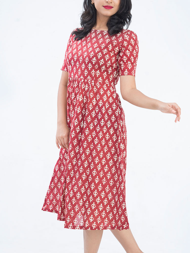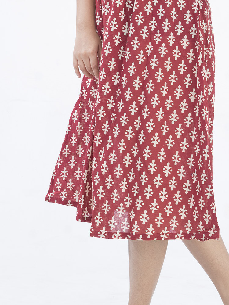 Intricate with details of handblock prints, this dress boasts of a round neck, short sleeves and flared hem.