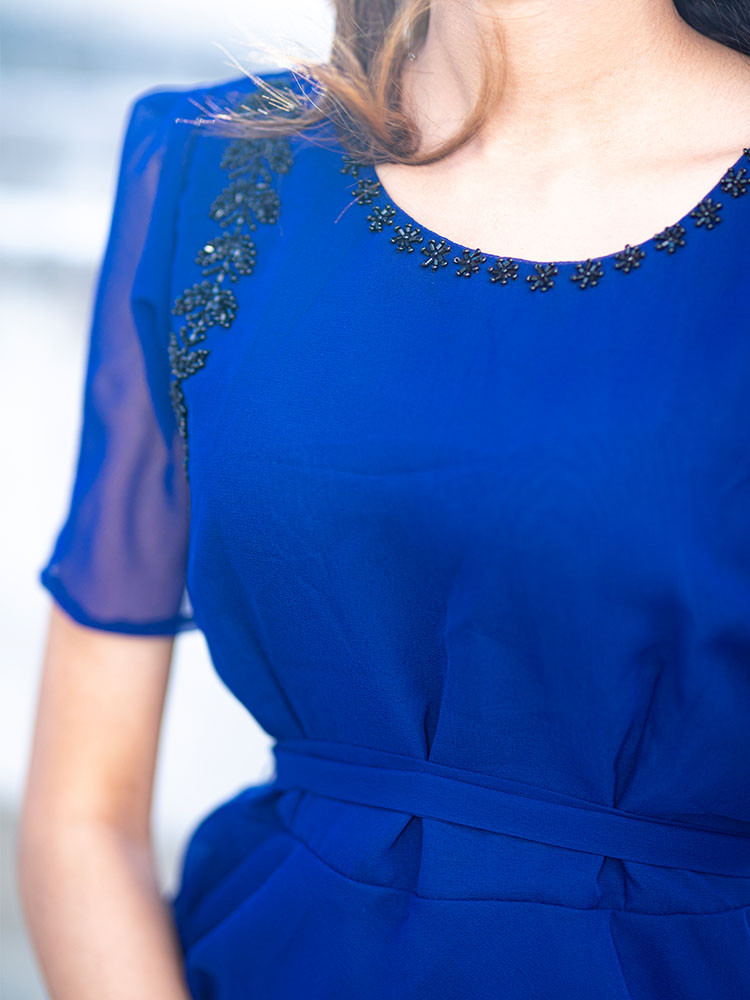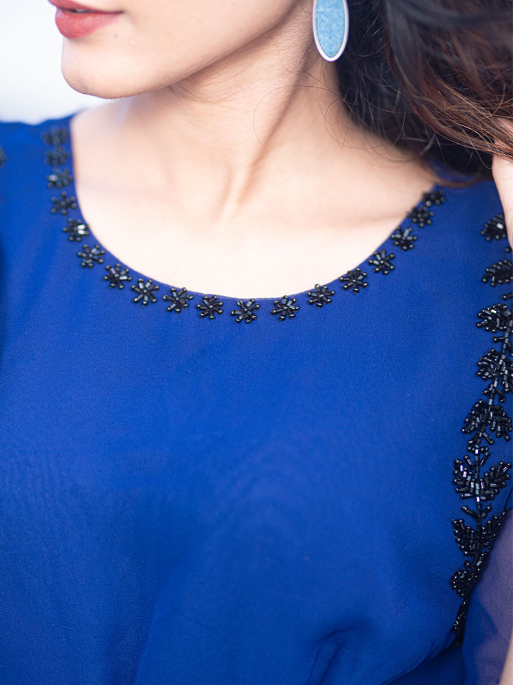 Woven in the shades of navy blue, this dress is rich with embellished details and has a round neck, flare sleeves and flared hem