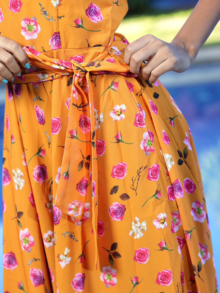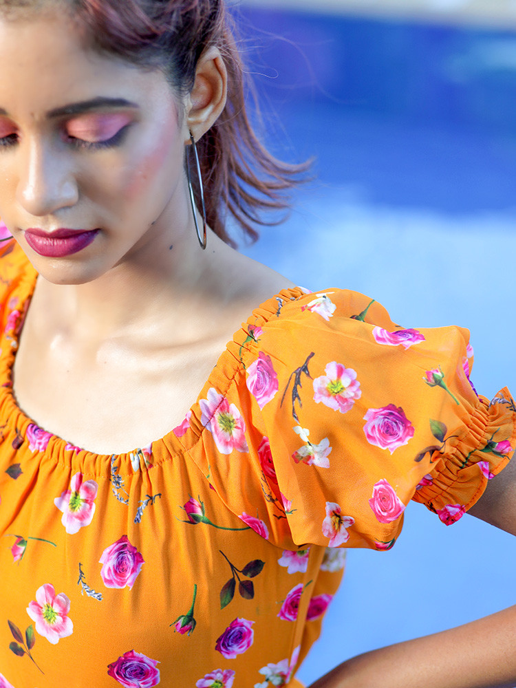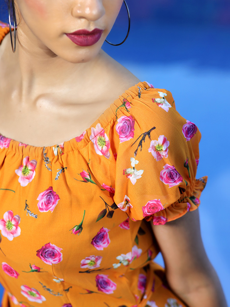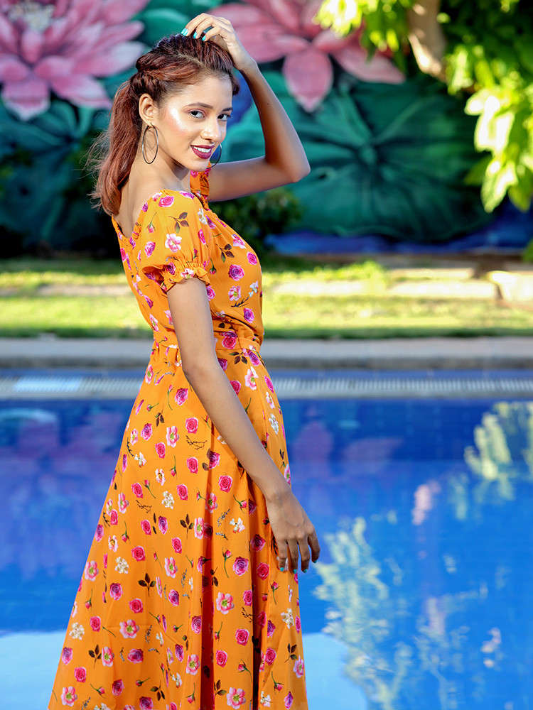 With its breezy floral print, frolicking hem, and chic neck, this orange maxi dress will infuse your closet with equal parts ease and elegance. Tailored with a puff sleeves, it features a self-fabric waist belt.
