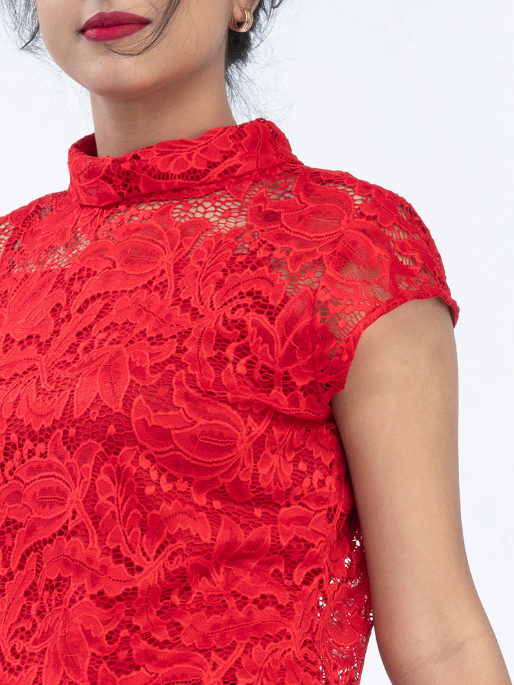With a tad of that wild touch, this dress features succulent red hues, a high neck, cap sleeves and camisole.