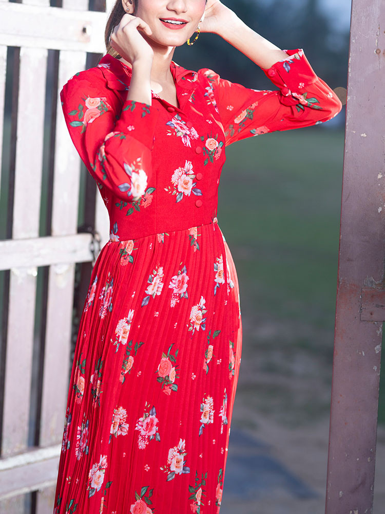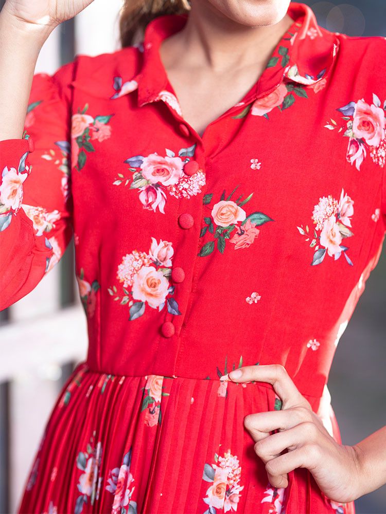 Bright in the shades of red, this dress packs in a collared neck, flared helm, three quarter sleeves, button closure and an attached lining.