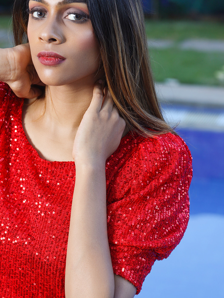 This sexy top is a versatile piece that will enhance the look of any ensemble you create with it! Be it for a cocktail party or a pre-wedding celebration, this red bling top is sure to add that oomph factor that will make everyone go wow!