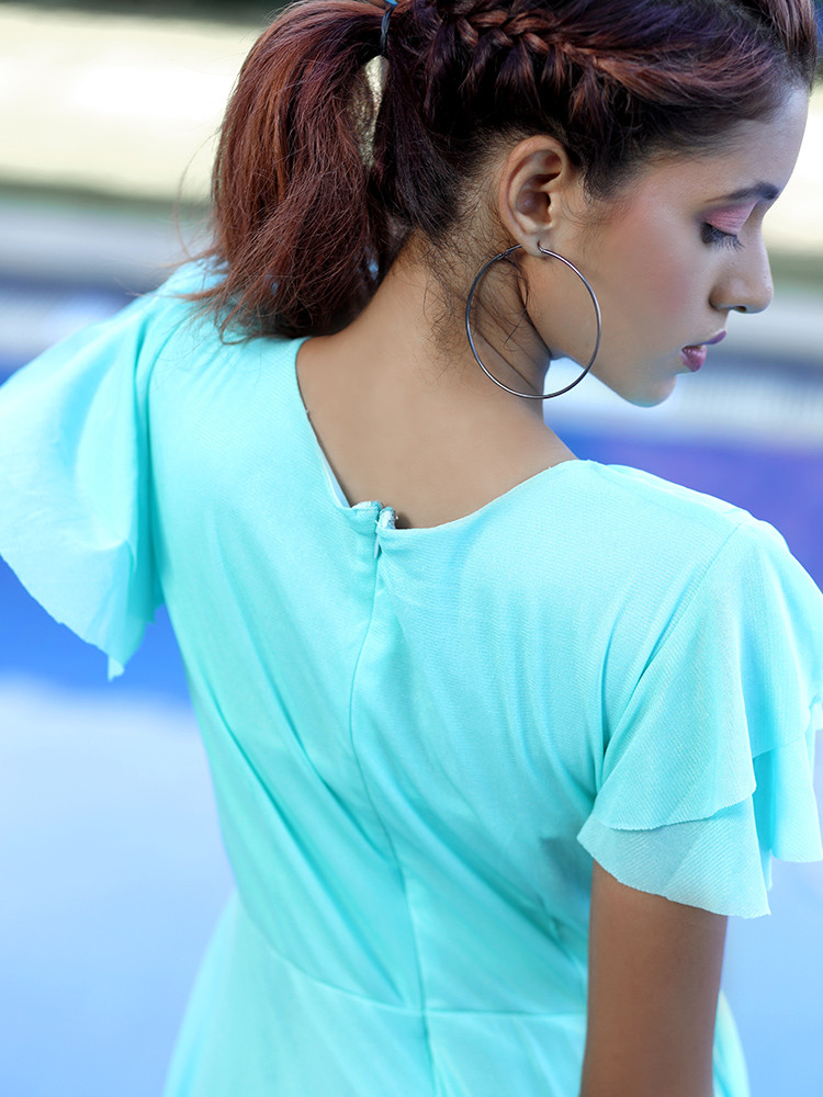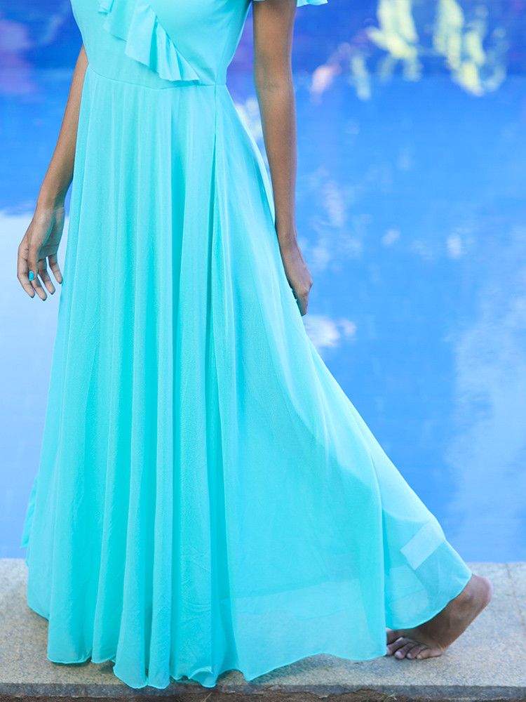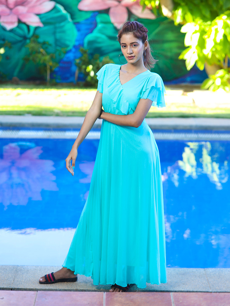 With a universally flattering silhouette and a summer-ready hue, this Solid blue Maxi dress makes for a stunning casual look. This fit and Flare dress features trendy ruffle details at bodice and sleeves