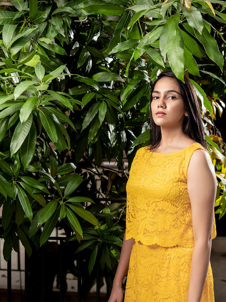 Tickle the stylish bone with this sleeveless A Line dress drenched in daffodil shades of yellow, that comes with a straight hem, a laced style and an attached lining.