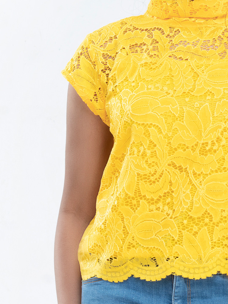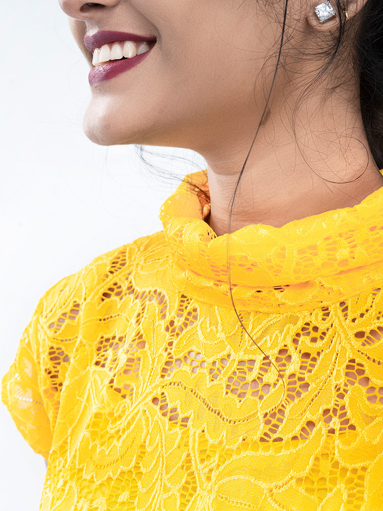 Docked up on the yellow front, this dress has a high neck, cap sleeves and camisole