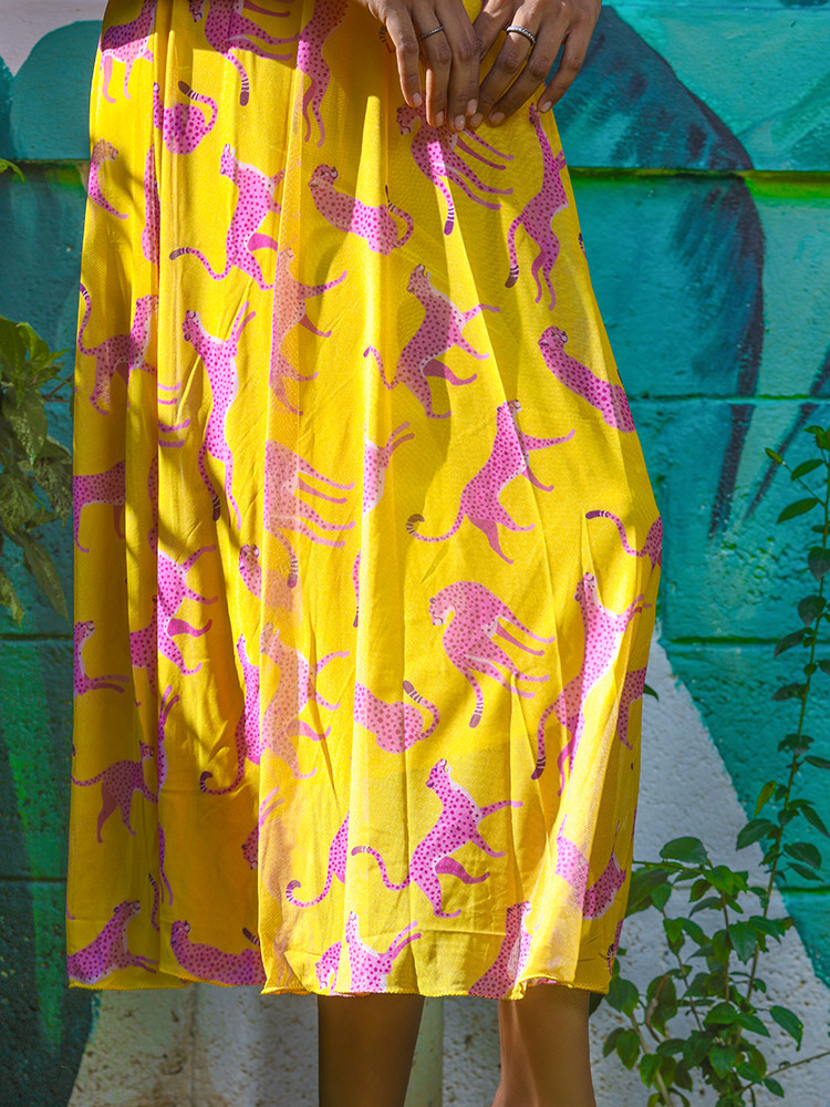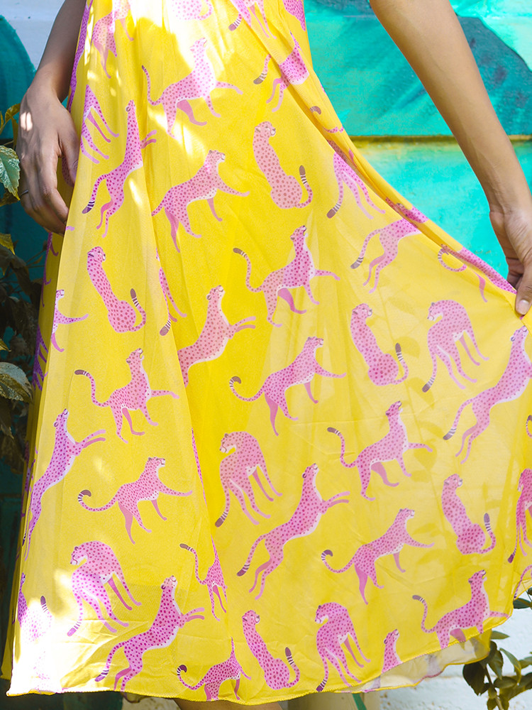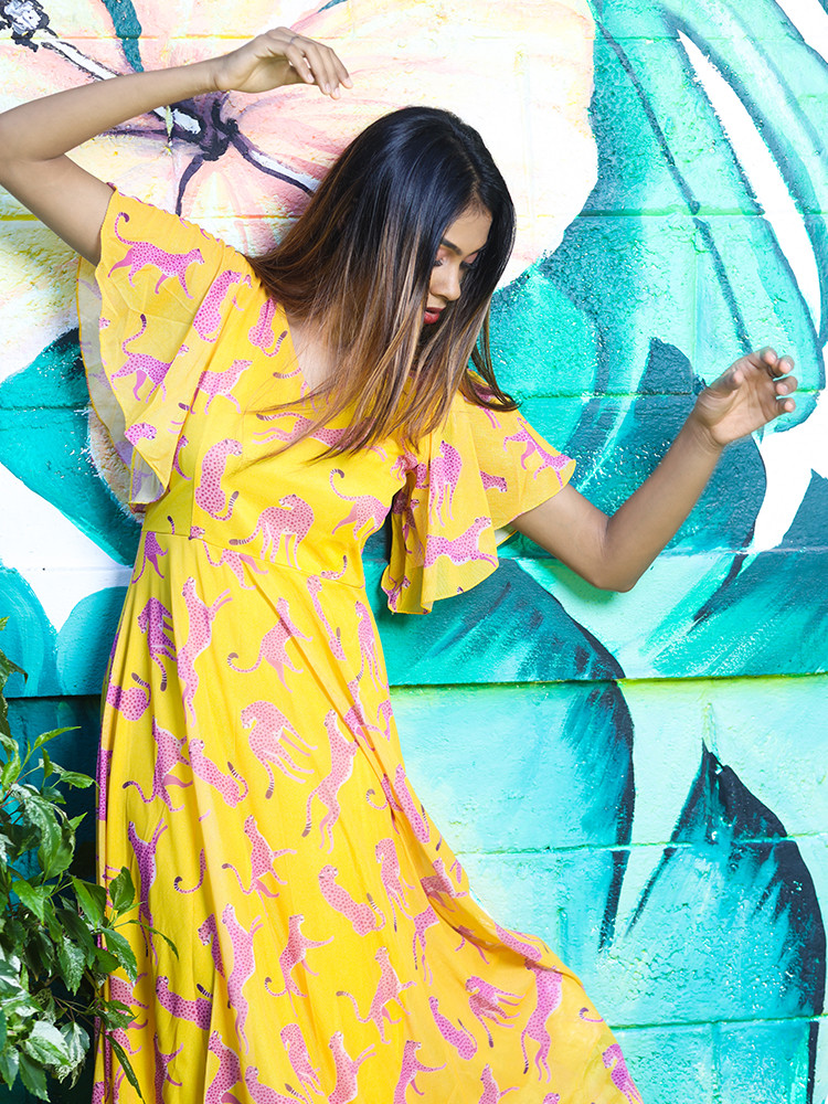 Go glam in this fit & flare midi dress with animal prints all over. Featuring ruffle sleeves, flared hem & a zipped back closure, perfectly style-able for all your casual day out.